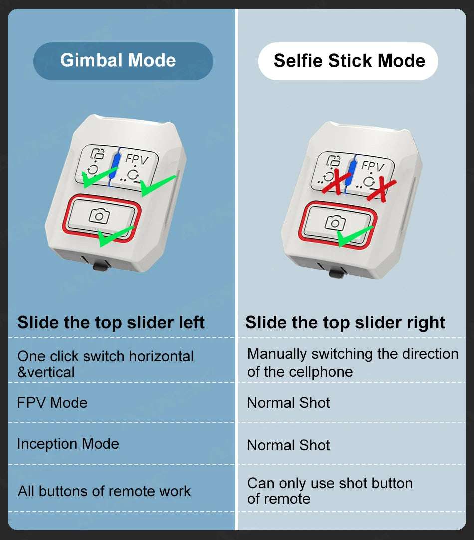 -When AXNEN A10 is in selfie stick mode, only the photo button (big button) of the remote control can be used, the two small buttons can't be used, and you can't use the FPV/Inception Mode/Horizontal&Vertical switching.